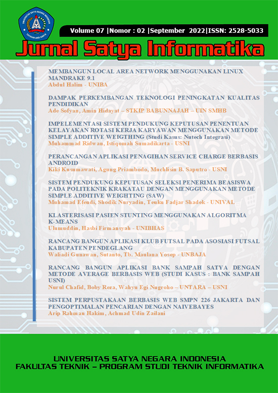 Jurnal Satya Informatika adalah informasi yang menyajikan tentang ilmu pengetahuan dan informasi penelitian atau aplikasi penelitian dan pengembangan terkini yang berhubungan dengan bidang Teknologi Informasi yang ada di Univeritas Satya Negara Indonesia (USNI). Jurnal Satya Informatika merupakan sarana publikasi dan ajang berbagi karya riset dan pengembangan di Fakultas Teknik Universitas Satya Negara Indonesia (USNI).Pemuatan artikel di jurnal ini dapat dikirim ke alamat Penerbit yang tercantum dibawah ini.