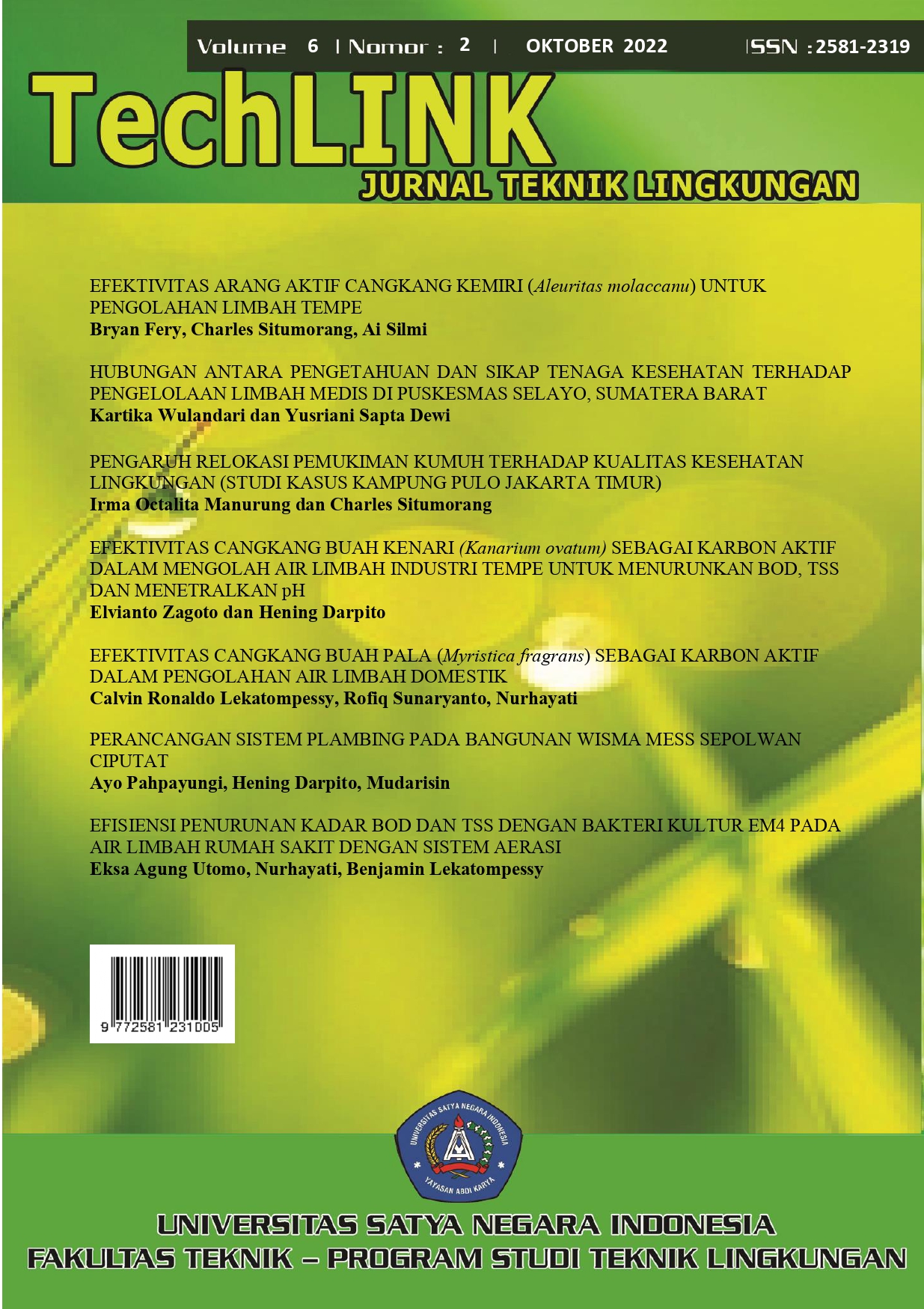 JURNAL TechLINK merupakan Jurnal Ilmiah yang menyajikan artikel original tentang pengetahuan dan informasi teknologi lingkungan beserta aplikasi pengembangan terkini yang berhubungan dengan unsur Abiotik, Biotik dan Cultural.