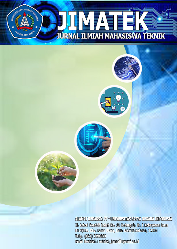 Jurnal Ilmiah Mahasiswa Teknik adalah Jurnal informasi yang menyajikan tentang pengetahuan dan informasi disegala bidang penelitian atau aplikasi penelitian dari skripsi mahasiswa dan pengembangan terkini yang berhubungan dengan bidang Teknologi Informasi, baik dari Teknik Informatika, Sistem Informasi, Manajemen dan Teknik Lingkungan yang ada di Universitas Satya Negara Indonesia. Jurnal Ilmiah Mahasiswa Teknik (JIMATEK) merupakan sarana publikasi dan ajang berbagi karya riset dan pengembangan ilmu pengetahuan bagi mahasiswa di Fakultas Teknik Universitas Satya Negara Indonesia (USNI). Pemuatan artikel di Jurnal ini dapat dikirim ke alamat Penerbit yang tercantum pada laman website OJS ini.