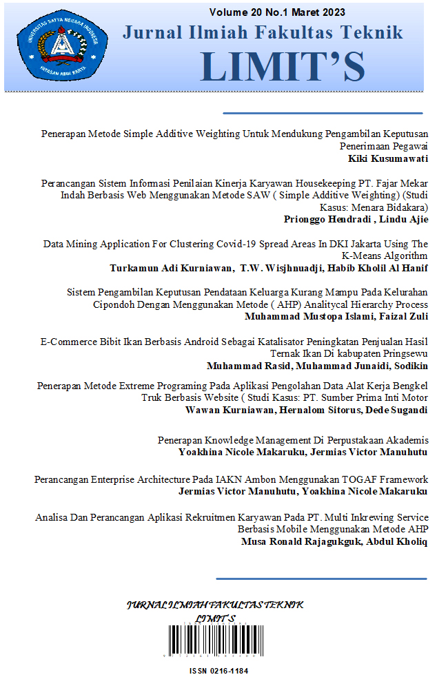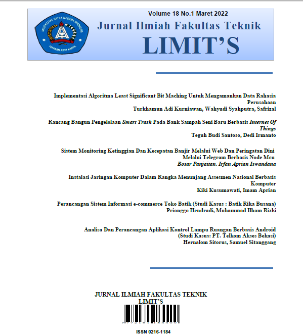 Jurnal Limits adalah informasi yang menyajikan tentang ilmu pengetahuan dan informasi penelitian dan pengembangan terkini yang berhubungan dengan bidang Ilmu Pengetahuan lain dan Teknologi Informasi yang ada di Univeritas Satya Negara Indonesia (USNI). Jurnal LIMITS merupakan sarana publikasi dan ajang berbagi karya riset dan pengembangan di Fakultas Teknik Universitas Satya Negara Indonesia (USNI).Pemuatan artikel di jurnal ini dapat dikirim ke alamat Penerbit yang tercantum dibawah ini. Informasi lebih lengkap untuk pemuatan artikel tersedia pada halaman terakhir yakni pada pedoman Penulisan Jurnal Ilmiah atau dapat dibaca pada setiap terbitan yang ada pada website OJS Teknik Informatika. Artikel yang masuk akan melalui proses selekasi editor atau mitra bestari. Jurnal ini terbit secara berkala sebanyak 2 (dua) kali dalam setahun yakni Februari dan Oktober yang kemudian mengalami perubahan terbit setelah pergantian pengurus menjadi Maret dan September, Jurnal Limits merupakan Jurnal Khusus untuk menyebarkan Karya Tulis dibidang segala hal yang berkaitan ilmu pengetahuan