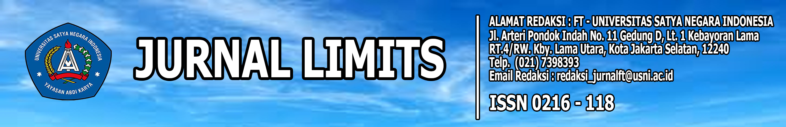 Jurnal Limits adalah informasi yang menyajikan tentang ilmu pengetahuan dan informasi penelitian dan pengembangan terkini yang berhubungan dengan bidang Ilmu Pengetahuan lain dan Teknologi Informasi yang ada di Univeritas Satya Negara Indonesia (USNI). Jurnal LIMITS merupakan sarana publikasi dan ajang berbagi karya riset dan pengembangan di Fakultas Teknik Universitas Satya Negara Indonesia (USNI).Pemuatan artikel di jurnal ini dapat dikirim ke alamat Penerbit yang tercantum dibawah ini. Informasi lebih lengkap untuk pemuatan artikel tersedia pada halaman terakhir yakni pada pedoman Penulisan Jurnal Ilmiah atau dapat dibaca pada setiap terbitan yang ada pada website OJS Teknik Informatika. Artikel yang masuk akan melalui proses selekasi editor atau mitra bestari. Jurnal ini terbit secara berkala sebanyak 2 (dua) kali dalam setahun yakni Februari dan Oktober yang kemudian mengalami perubahan terbit setelah pergantian pengurus menjadi Maret dan September, Jurnal Limits merupakan Jurnal Khusus untuk menyebarkan Karya Tulis dibidang segala hal yang berkaitan ilmu pengetahuan