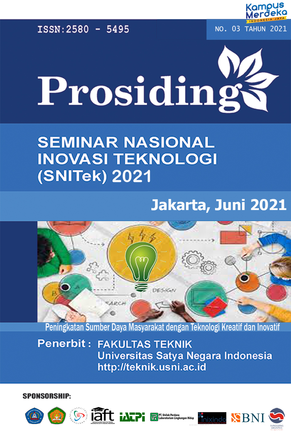 Jurnal SNITek Prosiding adalah informasi yang menyajikan tentang ilmu pengetahuan dan informasi penelitian atau aplikasi penelitian dan pengembangan terkini yang berhubungan dengan bidang Teknologi Informasi dan segala bidang keilmuan, baik Teknologi, Sistem Informasi, Teknik Informatika, Ilmu Komputer,Bidang Industri, Pengetahuan Alam, Kedokteran, Elektronik, Ekonomi Digital, Teknik Lingkungan, Artificial Intelegence (AI), Robotika dan lain-lain, yang ada di Univeritas Satya Negara Indonesia (USNI) serta Perguruan Tinggi lainnya. Jurnal SNITek Prosiding merupakan sarana publikasi dan ajang berbagi karya riset dan pengembangan di Fakultas Teknik Universitas Satya Negara Indonesia (USNI) serta Perguruan Tinggi Fakultas lain untuk pengembangan ilmu demi menghadapi era industri 4.0. Pemuatan artikel ilmiah ini di seminarkan dan di review oleh para reveiwer kemudian setelah memasuki beberapa tahapan proses penerbitan jurnal ilmiah yang sudah diseminarkan oleh para penulis atau pemakalah pada suatu pertemuan ilmiah yaitu SNITek. Prosiding ini dapat dikirim ke alamat Penerbit yang tercantum halaman web OJS teknik, Untuk Informasi lebih lengkap mengenai pemuatan artikel sudah tersedia pada halaman terakhir yakni pada pedoman Penulisan Jurnal Ilmiah atau dapat dibaca pada setiap terbitan yang ada pada website OJS Fakultas Teknik. Jurnal ini terbit secara berkala pada 2 (dua) Tahun 1 (satu) kali terbit dalam setiap penerbitannya setelah memasuki proses seminar ilmiah dan diterbitkan pada bulan Juni, pemuatan naskah dipungut biaya sesuai peraturan yang ditentukan, Jurnal Prosiding SNITek merupakan Jurnal Khusus untuk menyebarkan Karya Tulis dibidang segala Ilmu Pengetahuan.
